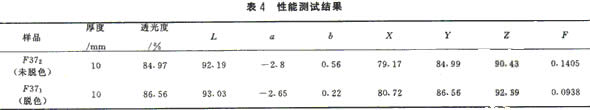 通过实验室小试研究中试实验,在中国耀华玻璃集团股份公司500t/d浮法线首家采用复合脱色剂,对玻璃进行脱色,效果良好。玻璃透光率提高,玻璃“白度”公式进行定量评价,结果如表4。