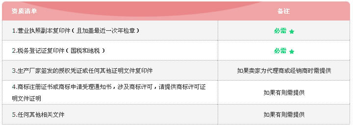 1.请准备好所有要求的资质材料复印件并加盖贵公司公章。请根据卖家平台提示上传要求的所有资质的电子文档。 2.请确保您提供的所有信息、材料完整、准确、及时、清晰。 3.网上商城可能根据中国法律规定或其政策不时要求您提供更多的资质证明材料。 4.网上商城客服随时解答您任何疑问,提供全方位技术支持。