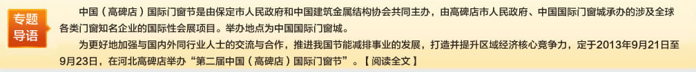 2013年9月21日至23日,由河北省科学技术厅、河北省商务厅、河北省住房和城乡建设厅、中国建筑金属结构协会、中国房地产业协会、保定市人民政府联合主办,由高碑店市人民政府、中国国际门窗城承办,22家省级协会协办的第二届中国(高碑店)国际门窗节在河北省高碑店市中国国际门窗城隆重举行。