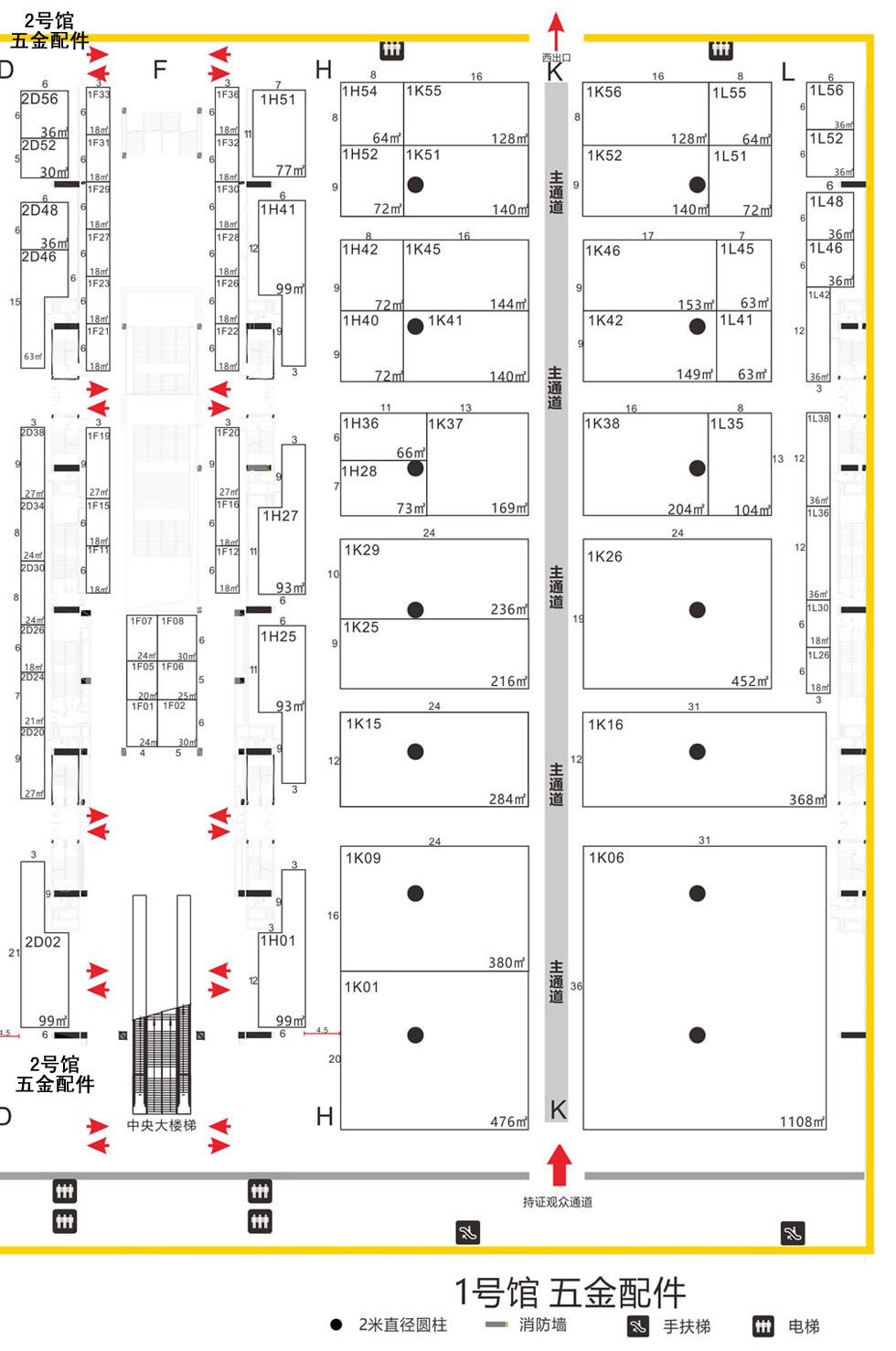 ●表示此处有柱子,其直径为2米。 备注:主通道两侧展位需加收10%