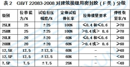 镶装玻璃以外的建筑接缝用密封腕F类)根据位移能力分为25级、20级、12.5级和7.5级,其中25级和20级根据拉伸模量分别对低模和高模进行了区分。分级及主要性能要求见表2。