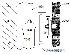 R型背挂式组合干挂件(见图2),此件为垂直直角斜燕尾板型伸缩片,通过定位切槽快速准确,在饰板背面固定,因而对板材表面和边缘无损坏,板与板之间不会造成相互荷载累积,每块石板完全独立承载,具有更好的安全性能,为设计师提供任意设计各类图形和可创造性拼挂,增加了足够的设计空间。而具有更高的安全系数特别适用于中、高层石材幕墙使用,十分有利于永久性石材外装修。