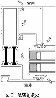 扇料与玻璃扣条形成的空腔处的气密性较差是断热窗存在一个普遍的问题,由于玻璃扣条是在安装好玻璃后再扣上去的,与扇料的配合难免存在缝隙,而玻璃与扇料间通常采用胶条