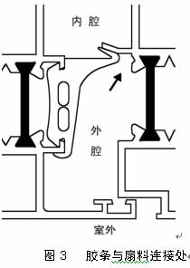 断热窗存在的另一个较普遍的问题,是胶条与窗扇料连接处产生的传导热损失。在断热窗产品设计过程中,设计人员往往只是注意采用胶条密封,形成前后两个空腔,却忽视了胶条与窗扇料搭接不足,存在一定的空隙,从而在整个窗扇的周围有一圈通长的外露部分,使外腔内的冷空气直接与窗扇料内侧接触,造成断热不彻底,窗扇内侧可能产生结露,详见图3。