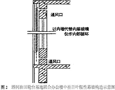 遮阳的综合改进。由于太阳直射对建筑的冷热负荷有直接影响,冬季的阳光进入室内,夏季遮阳都能有效地控制负荷总值。但传统建筑中的百叶或挂于室内,难以高效控制已入室内的热量;或悬于室外,不能形成循环通风道,或多或少地对建筑节能有一定的负面影响。中挂百叶是幕墙改革的一个较好方案,法兰克福商业银行总部大厦[2 ] 是其中一个较好的例子,见图1。这种百叶幕墙解决了适时调节百叶的角度,以最佳状态达到节能的目的。