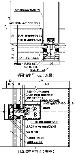 2.玻璃支撑系统的变更:原设计采用JANSHEN系统玻璃支撑钢钉承重,辅以铝质支撑条扩大支撑断面,专用性较强,经研讨论证,决定改用100×50×10的热浸