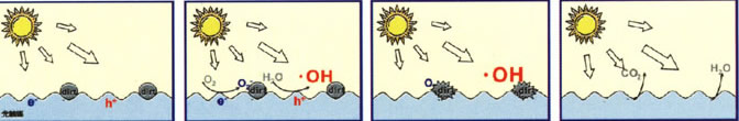 利用受到光能而活性化的电子和空穴对,生成氧化力极强的氢氧基(-OH),起到把有毒物质、气味等成分分解成二氧化碳和水的作用。