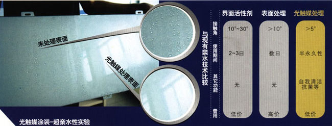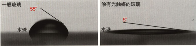   涂有光触媒的表面,因为超亲水性维持很小的接触角。