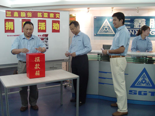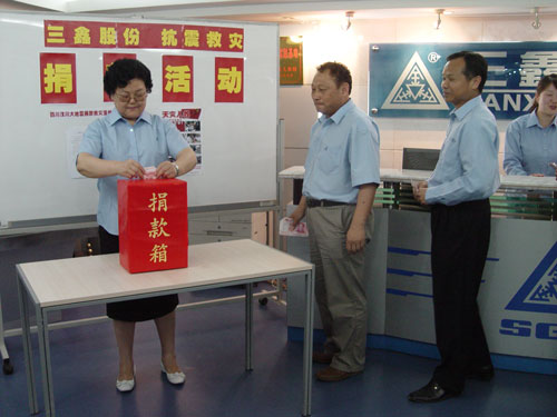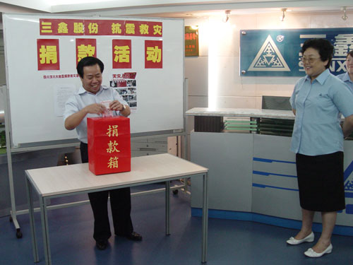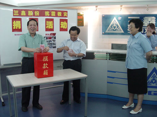 5月14日下午,三鑫公司董事长费元文、总裁韩平元、常务副总裁兼财务总监孟菲、董秘石志并、总工程师花定兴等公司经营班子成员带头,在公司深圳总部进行了捐助活动,股份公司职能部门和幕墙工程公司总部工程分公司全体员工积极响应公司的倡议,当场捐款支援灾区。与此同时,北京、上海、沈阳、大亚湾各子(分)公司也组织员工进行了捐款活动。仅14日下午,全公司员工个人捐款就达到122663.7元。截止到5月17日,全公司捐款共计432663.7元,其中公司捐款20万元,总裁韩平元个人捐款11万元,员工个人捐款共计122663.7元。目前,捐款活动还在继续进行中。5月20日公司将其中的10万元捐款交给深圳市慈善会;另外的332663.7元上交一航统一捐献给灾区。