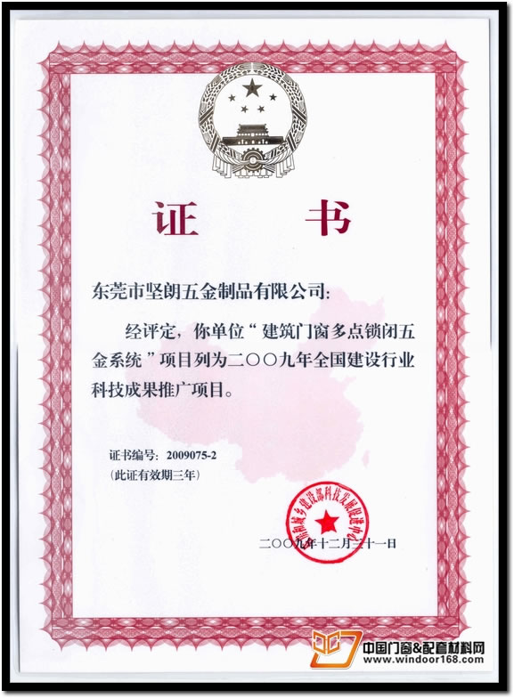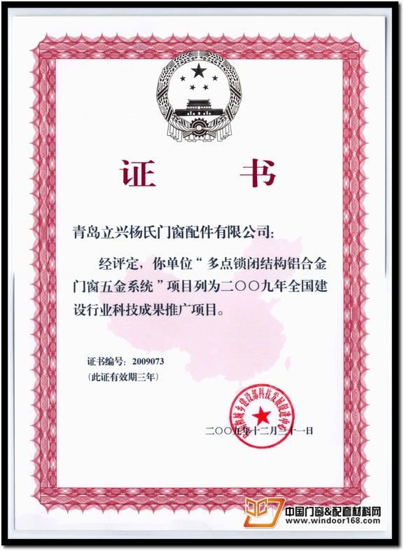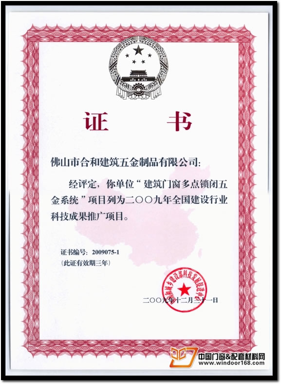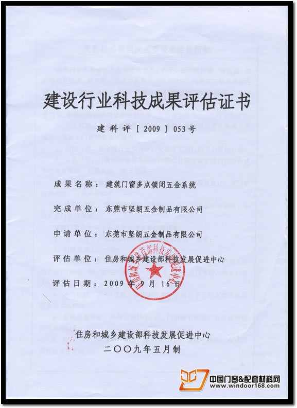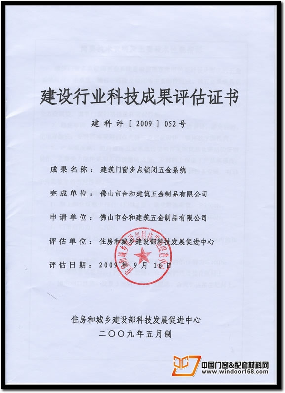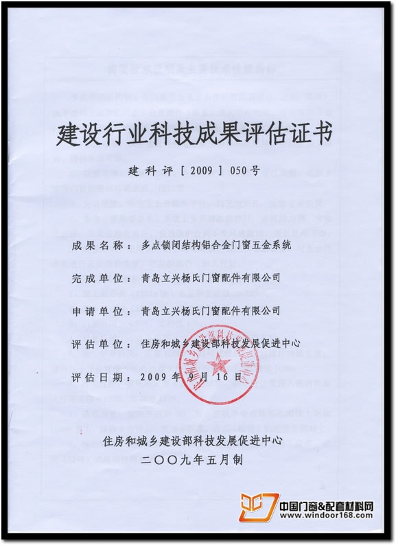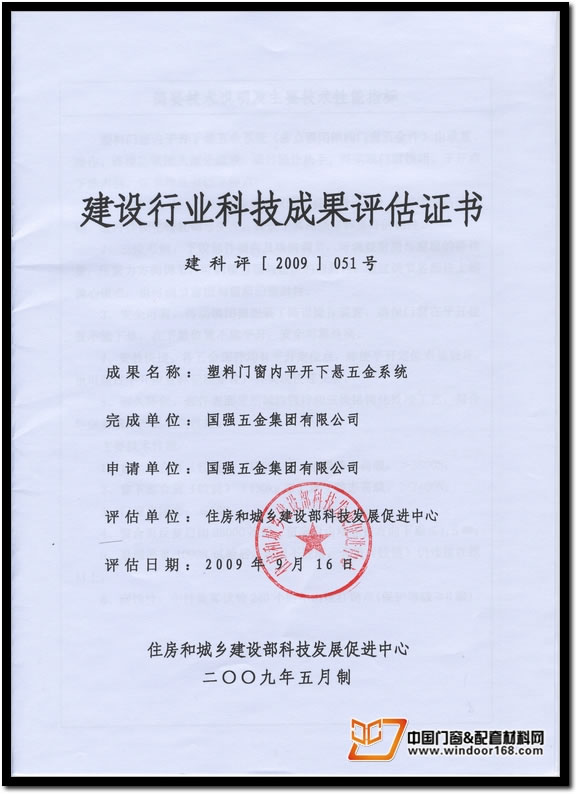 中国建筑金属结构协会建筑门窗配套件委员会组织行业骨干企业,积极配合国家节能节材产业政策的要求,经过充分准备,顺利地通过了评估,并被列为二○○九年全国建设行业科技成果推广项目。