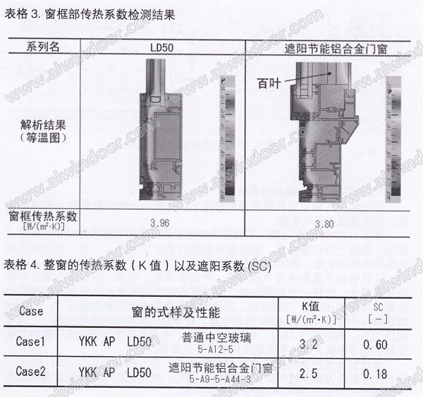 YKK AP断桥铝合金系列LD50及遮阳节能铝合金门的外框部等温图、传热系数结果如表格3所示。表格4则是这两种窗型的传热系数(K值)和遮阳系数(SC)的计算结杲。例1是单独采用普通中空玻璃和断桥铝合金型材时的计算结果。而例2满足江苏省遮阳性能标准中最高等级的遮阳节能铝合金门窗。本文将计算并比较,分别使用普通断桥铝合金LD50和遮阳节能铝合金门窗的住宅节能效果。