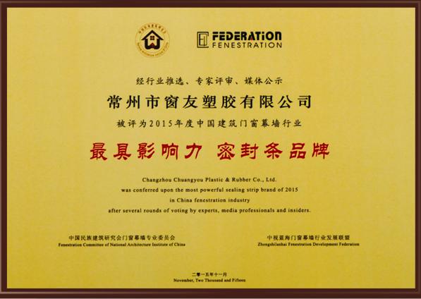 证书名称: 2015年度最具影响力密封条品牌奖牌