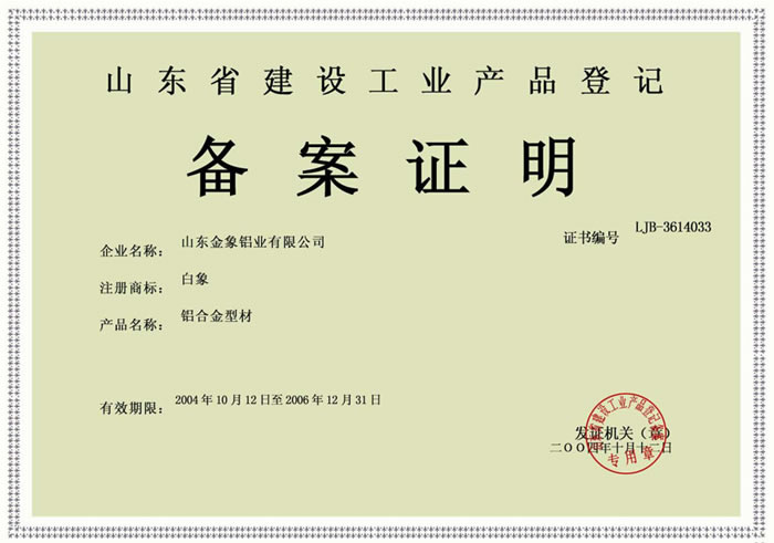 山东建设工业产品登记备案证明 |