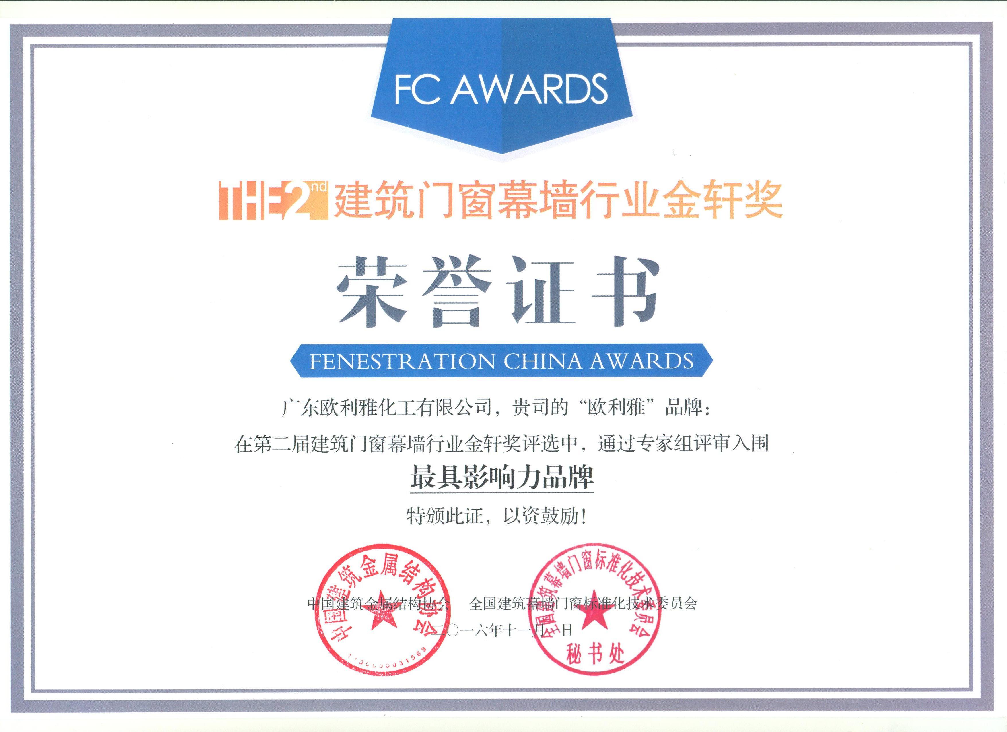 建筑门窗幕墙行业金轩奖荣誉证书 |