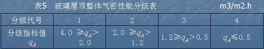 玻璃屋顶整体(含开启部分)采用压力差为10Pa时的单位面积空气渗透量qA作为分级指标,分级指标应符合下表的规定。