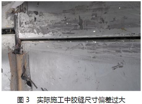 3. 实际板块的安装尺寸偏差过大,部分胶缝太窄。如图3;