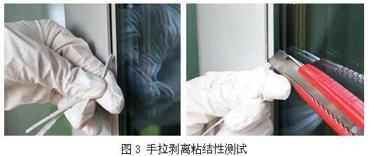 取工厂或工地实际所用基材进行测试,按照实际施工要求和养护条件进行施工和养护,待门窗胶完全固化后,进行剥离粘接性测试,查看其粘接情况。