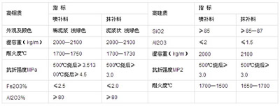 耐高温粘结剂分为: (1)高铝质系列喷补料、抹补料; (2)高硅质系列喷补料、抹补料。 该系列耐高温粘结剂可广泛适用于各种工业、民用锅炉的高温炉膛、炉墙、前后拱等部位的砌筑、修补和喷涂,更广泛适用于各种高温窑炉热修,特别是机焦炉炭化室各部位出现的凸凹、剥蚀、裂缝、熔融、掉砖、错台的热修以及电熔炉、冶炼炉的喷堵和砌筑。 该产品在刚开始的基础上又增加了新的防老剂、促进剂、组凝剂等多种化学助剂,使产品的质量大大的提高,使耐火度、抗折强度大大提高、粘结性能又有新的提高,易于挂料,固化快、无泡不裂、耐磨性能增强,使用范围更广。 技术指标与性能: