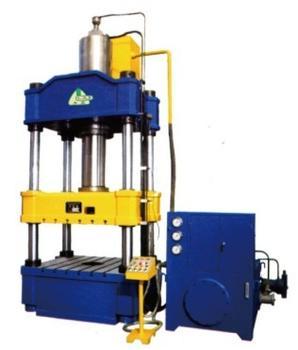 基本原理是油泵把液压油输送到集成插装阀块,通过各个单向阀和溢流阀把液压油分配到油缸的上腔或者下腔,在高压油的作用下,使油缸进行运动.液压机是 利用液体来传递压力的设备。液体在密闭的容器中传递压力时是遵循帕斯卡定律。四柱液压机的液压传动系统由动力机构、控制机构、执行机构、辅助机构和工作介质组成。动力机构通常采用油泵作为动力机构,一般为积式油泵。为了满足执行机构运动速度的要求, 选用一个油泵或多个油泵。低压(油压小于2.5MP)用齿轮泵;中压(油压小于6.3MP)用叶片泵;高压(油压小于32.0MP)用柱塞泵。各种可塑性 材料的压力加工和成形,如不锈钢板钢板的挤压、弯曲、拉伸及金属零件的冷压成形,同时亦可用于粉末制品、砂轮、胶木、树脂热固性制品的压制。 5工作介质 液压机所用的工作介质的作用不仅是传递压强,而且保证机器工作部件工作灵敏、可靠、寿命长和泄漏少。液压机对工作介质的基本要求是:①有适宜的流动性和低的可压缩性,以提高传动的效率;②能防锈蚀;③有好的润滑性能;④易于密封;⑤性能稳定,长期工作而不变质。液压机最初用水作为工作介质,以后改用在水中加入少量乳化油而成的乳化液,以增加润滑性和减少锈蚀。19世纪后期出现了以矿物油为工作介质的油压机。油有良好的润滑性、防腐蚀性和适度的粘性,有利于改善液压机的性能。20世纪下半叶出现了新型的水基乳化液,其乳化形态是“油包水”,而不是原来的“水包油”。“油包水”乳化液的外相为油,它的润滑性和防蚀性接近油,且含油量很少,不易燃烧。但水基乳化液价格较贵,限制了它的推广。 6结构 驱动系统 液压机的驱动系统主要有泵直接驱动和泵-蓄能器驱动两种型式。泵直接驱动 这种驱动 系统的泵向液压缸提供高压工作液体,配流阀用来改变供液方向,溢流阀用来调节系统的限定压强,同时起安全溢流作用。这种驱动系统环节少,结构简单,压强能按所需的工作力自动增减,减少了电能消耗,但须由液压机的最大工作力和最高工作速度来决定泵及其驱动电机的容量。这种型式的驱动系统多用于中小型液压机,也有用泵直接驱动的大型(如120000千牛)自由锻造水压机。
