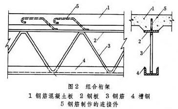 组合梁目前大多采用弹性设计,其工作方式随施工方法的不同而不同。最简单的情况是钢梁先安放在支座上,作为以后灌筑钢筋混凝土板的承重结构。当混凝土未达到设计强度之前,钢梁承受它本身自重、施工活荷载、模板重量以及在其上灌筑钢筋混凝土板的自重。当混凝土达到设计强度后,新增的恒载(如找平层)以及作用于楼面的活荷载(见荷载),全部由组合梁承受。 连接件也称剪力件,它保证钢梁与钢筋混凝土板成为整体而共同工作。连接件的形式较多,基本上分成用钢筋制作的柔性连接件(图1a),和用带加劲肋的角钢制作的刚性连接件(图1c)。带头栓钉作连接件施工速度快、质量好,使用较为普遍;此外,也有用摩擦型高强螺栓传递预制钢筋混凝土板与钢梁之间的剪力;这两种连接件,一般也属于柔性连接件。 组合梁已有约60年的历史,在50年代获得广泛的应用。中国自50年代开始研究,首先用在铁路桥梁上,此后在房屋建筑上也逐渐采用。 组合板 在压型钢板上先焊接连接件,后灌筑钢筋混凝土板而形成组合板结构。连接件采用带头栓钉或钢筋。 在混凝土未达到设计强度之前,施工活荷载、钢筋混凝土板及压型钢板自重,由压型钢板单独承受。当混凝土达到设计强度后,组合板上的找平层、活荷载等荷载,全部由组合板承受。组合板除需验算强度及挠度外,还需验算颤动。 压型钢板在组合板结构中起着双重作用,在施工阶段作为模板;在使用阶段作为抗拉主钢筋抵抗作用于组合板底面的正弯矩,还可利用压型钢板的波纹间的槽,供铺设电力、通信与通风管道之用。组合板自50年代初开始采用,70年代已获得广泛的应用。 组合桁架 在钢桁架上弦焊接钢筋或带头栓钉的柔性连接件,然后灌筑钢筋混凝土板而形成组合桁架(图2)。桁架上弦用钢板或T形钢,上浇钢筋混凝土板,下弦用槽钢或T形钢,腹杆用圆钢。采用组合桁架可使管道穿越结构层比较方便。50年代以来在屋盖结构中,采用另一种结构体系的组合桁架,上弦杆用钢筋混凝土构件,受拉腹杆及下弦杆用钢构件,受压腹杆用钢筋混凝土或钢构件。在节点处将钢构件和钢筋混凝土构件组装成组合桁架。此种组合桁架跨度为12~24米。 组合柱 在薄壁钢管内灌注混凝土而成,也称钢管混凝土柱。截面形式有圆形和方形。其工作特点是:①核芯混凝土可以防止管壁丧失局部稳定性,防止钢管内表面锈蚀;②钢管可以阻止核芯混凝土在纵向压力作用下的侧向膨胀和酥松剥落,使其处于三向受压状态,从而提高其抗压强度和抗变形能力。从后一特点看,圆管比方管更有效。此外,圆管对气流阻力小,不易积灰尘;圆管表面积最小,油漆和维修费用低。